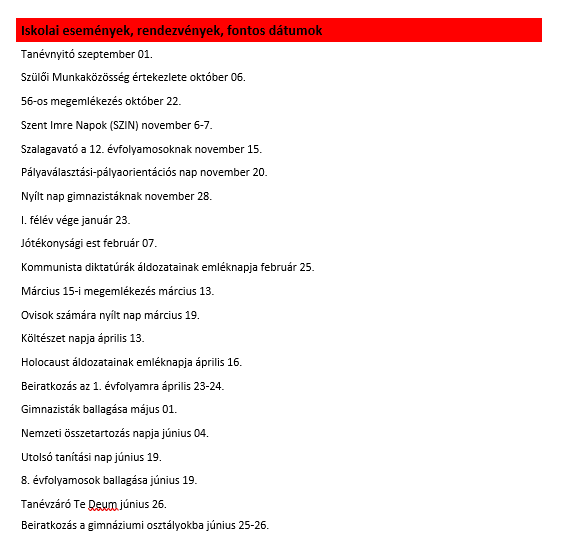 Jelentősebb iskolai rendezvények, események a 2025/26. tanévben