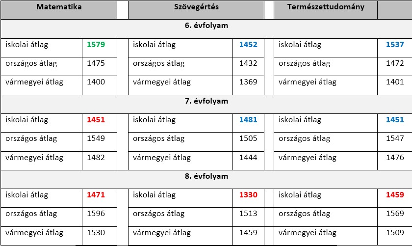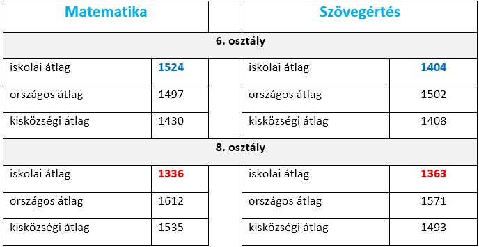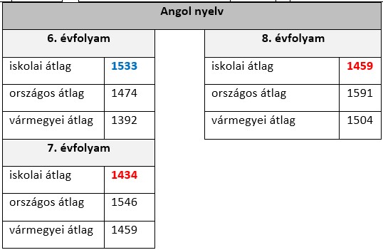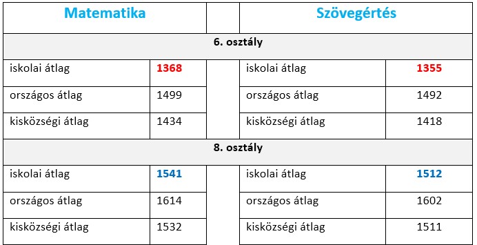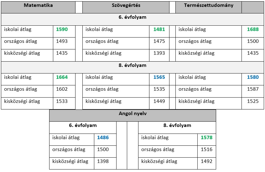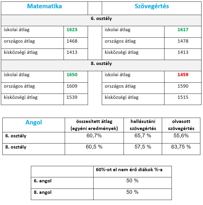 Az Oktatási Hivatal a nyelvi mérések eredményeiből nem készített sem intézményi, sem tanulói elemzést. Az idegen nyelvi mérések eredményét az iskola az Oktatási Hivatal által közzétett javítókulcsok alapján állapította meg. A szövegértés és a matematikai mérések országos és feladatellátási hely szintű mutatói az Oktatási Hivatal felületéről (https://okm.kir.hu/fit2/) összegyűjtve az alábbi táblázatokban láthatóak: